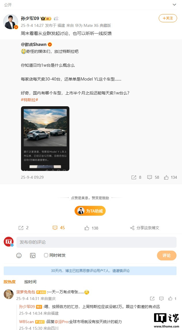 对此,博主@孙少军09今日在微博称,“按照各方的汇总,上周特斯拉应该没破2万,跟这个数差的有点远。”